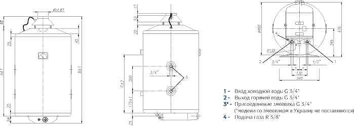 1 - Вход холодной воды G 1 1/4" 2 - Выход горячей воды G 1 1/4" 3 - Рециркуляционный патрубок G 4 - Слив G 1/2" 5 - Подача газа |