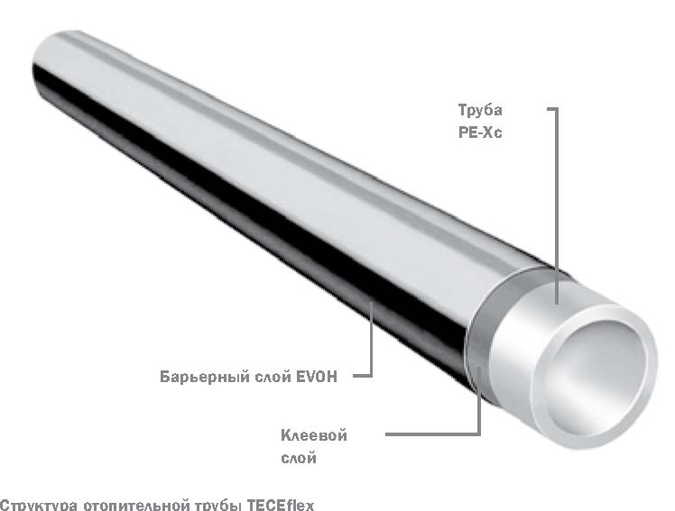 • защитного слоя (EVOH — этилвинилалкоголь) серебристого цвета, выполняющего антидиффузионную функцию. Благодаря этому слою данные трубы легко визуально отличить от других видов труб TECEflex.