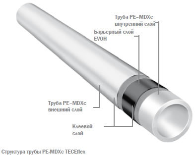 Для производства труб PE-MDXc используется метод новейшей пятислойной технологии. Антидиффузионный слой размещен в середине стенки PE-MDXc, что особенно эффективно для защиты этого слоя от повреждений при укладке теплых полов, в которых на трубы действует большая нагрузка покрытия пола.