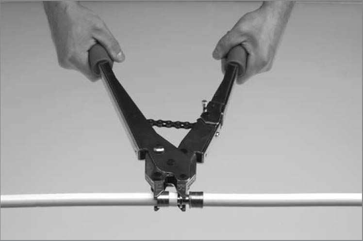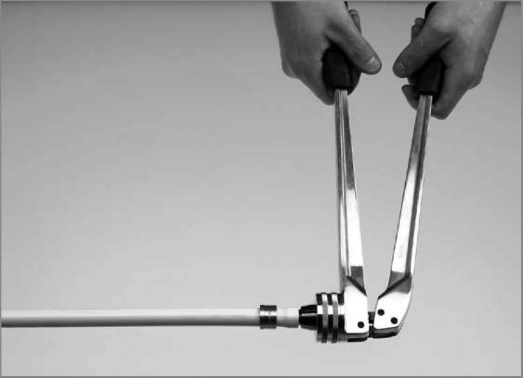 Установить расширительную головку соответствующего соответствующие маркированные насадки. размера. Надвинуть конец трубы до упора на расширительную головку, после чего расширить.Трубу повернуть на четверть оборота и расширить еще раз.