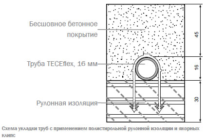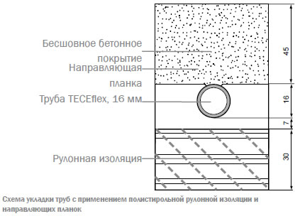 Основой этой конструкции являются изготовленная из вспененного полистирола 33/30 PST-SE рулонная теплоизоляция, дополненная при необходимости для соответствия требованиям DIN 4752, DIN EN 1264 изоляционной пластиной, и монтажные направляющие планки для укладки и фиксации труб.