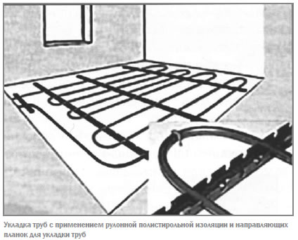 в) Конструкция напольного отопления с применением рулонной полистирольной изоляции и направляющих планок для укладки труб.