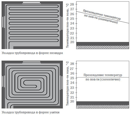 При устройстве напольного отопления используются две принципиальные схемы укладки греющих трубопроводов: