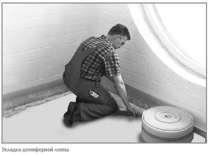 Укладка демпферных лент производится на стене от верхнего края бетонного основания пола с заходом на готовый пол. При укладке необходимо следить за непрерывным наложением вдоль дверных коробок, ступеней и опор.