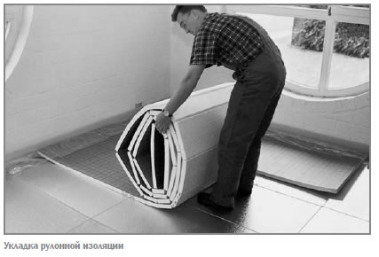 Сначала рулонная изоляция укладывается вдоль помещения, при этом маркировка различных рулонов должна совпадать, что упростит дальнейшую укладку труб. Углы помещений и ниши покрываются позже оставшимися частями материала.