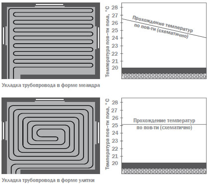 При устройстве напольного отопления используются две принципиальные схемы укладки греющих трубопроводов: