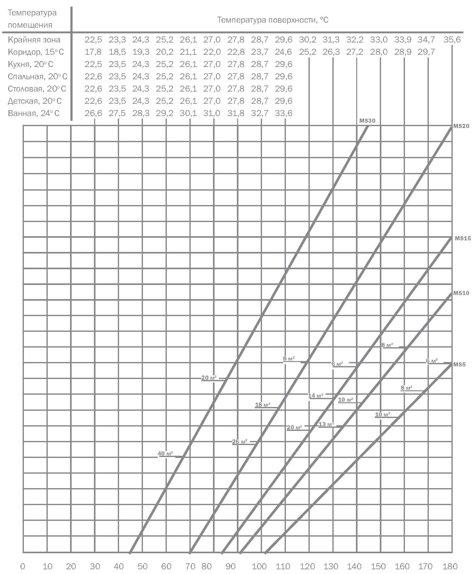 Диаграмма определения температуры поверхности пола. Покрытие пола: плитка, PVC, камень, мрамор. R=0,01 м2Вт/К