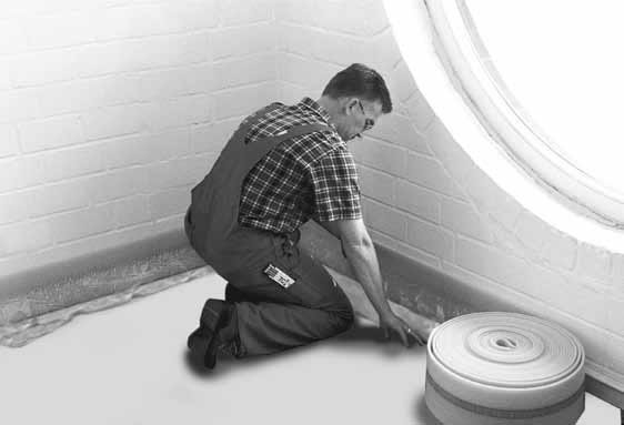 Укладка демпферных лент производится на стене от верхнего края бетонного основания пола с заходом на готовый пол. При укладке необходимо следить за непрерывным наложением вдоль дверных коробок, ступеней и опор.